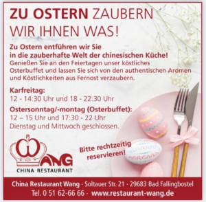 Das China Restaurant Wang in Bad Fallingbostel bietet seit 1992 durch seine großzügige Gestaltung viel Raum für die Vorlieben seiner Gäste. Der lichtdurchflutete Wintergarten, die verschwiegenen Nischen, die Kinderecke oder der Platz in der Nähe der offenen Kochstelle an Buffettagen, bieten ein Restauranterlebnis ganz nach dem individuellen Geschmack der Gäste. Das Restaurant Wang verzaubert seine Gäste immer wieder aufs Neue mit Speisen, die ihren Ursprung in der einzigartigen Vielfalt und Kreativität der asiatischen Küche haben.